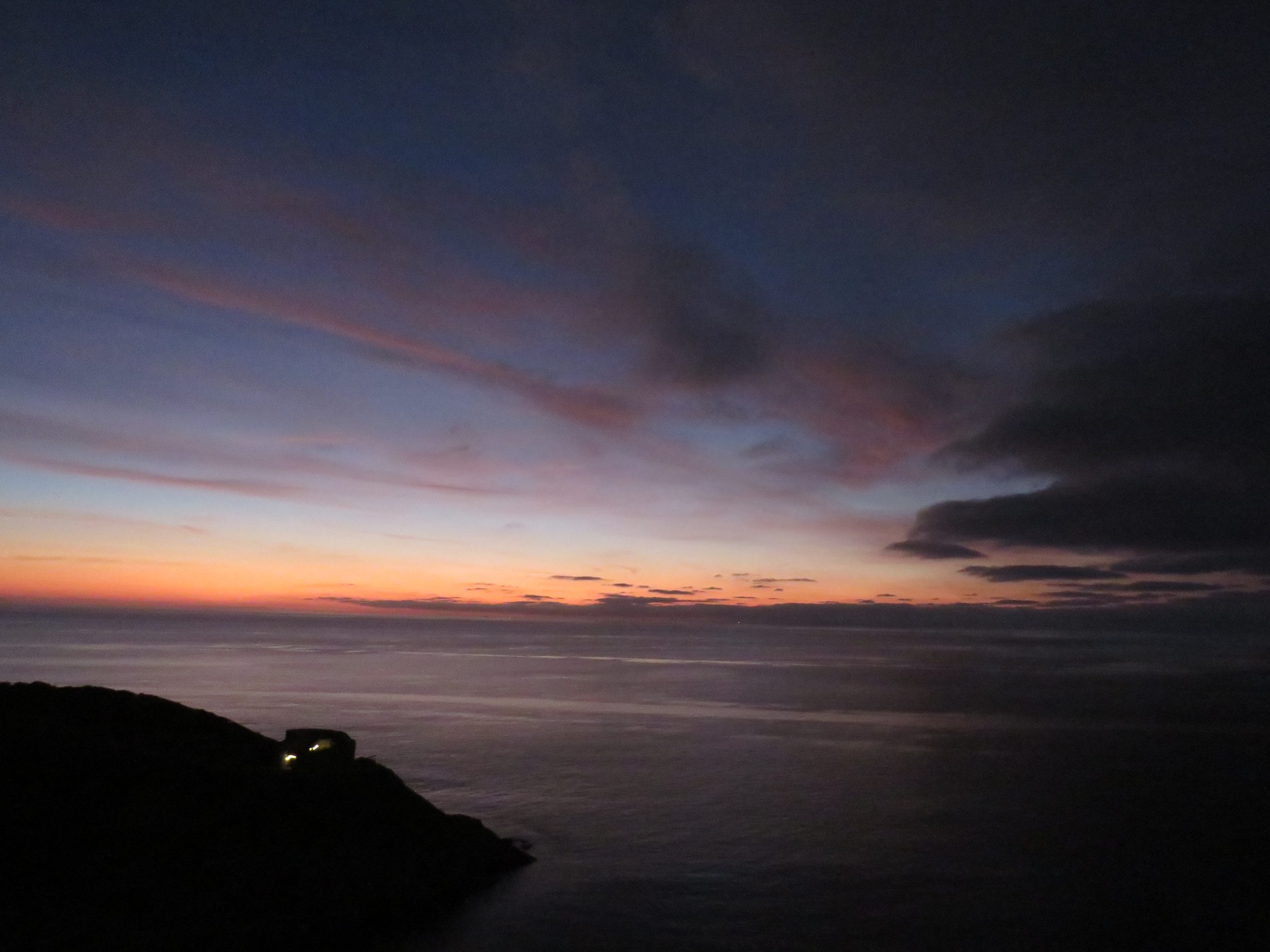 Cuando faltan unos veinte minutos para la salida del sol las nubes se encienden con un vivo color rojizo que lentamente se va extendiendo por el horizonte. La luz del nuevo día barre las tinieblas y ya podemos vernos las caras. Los paisajes del Monte Hacho vuelven a ser reconocibles.