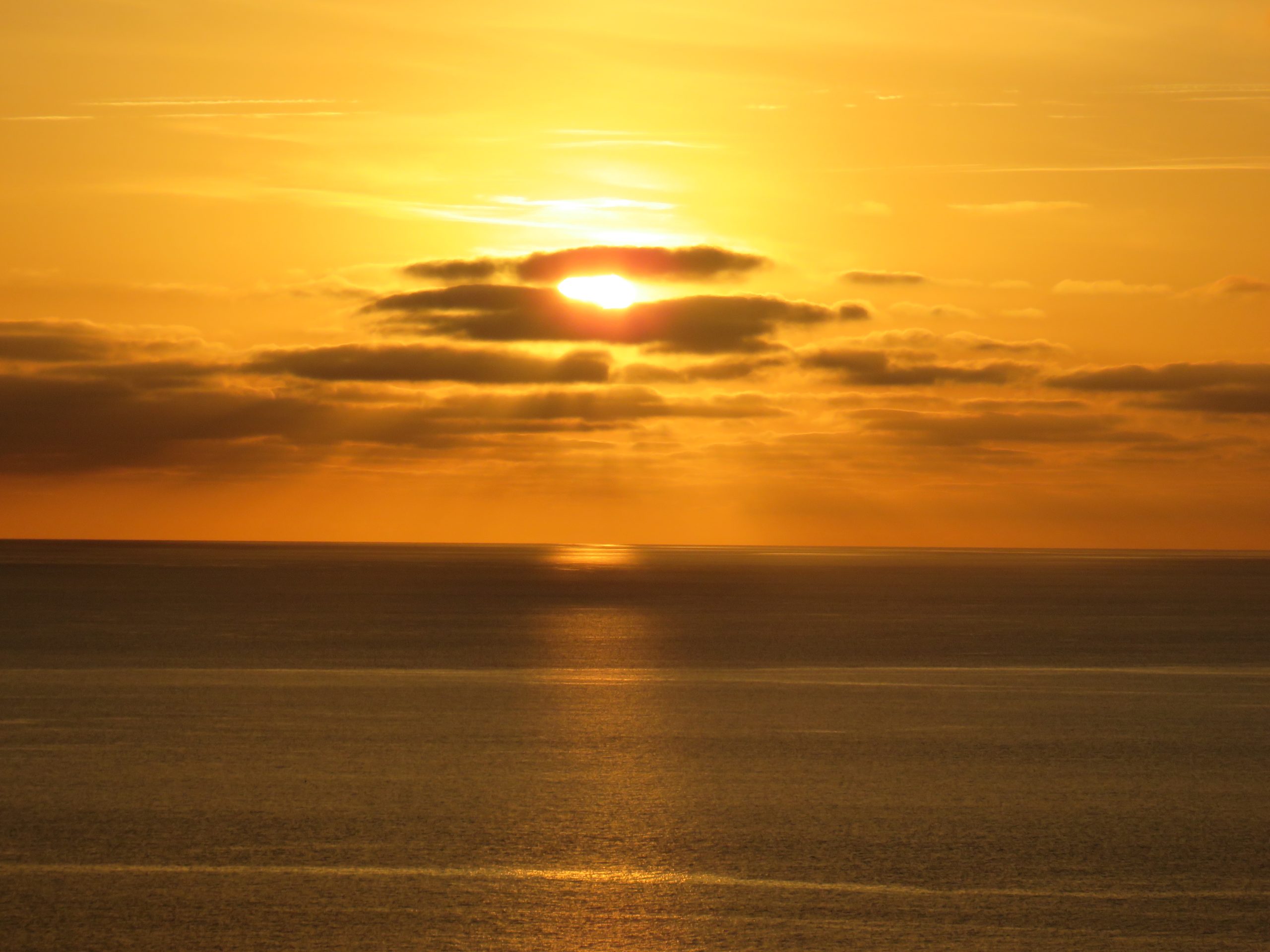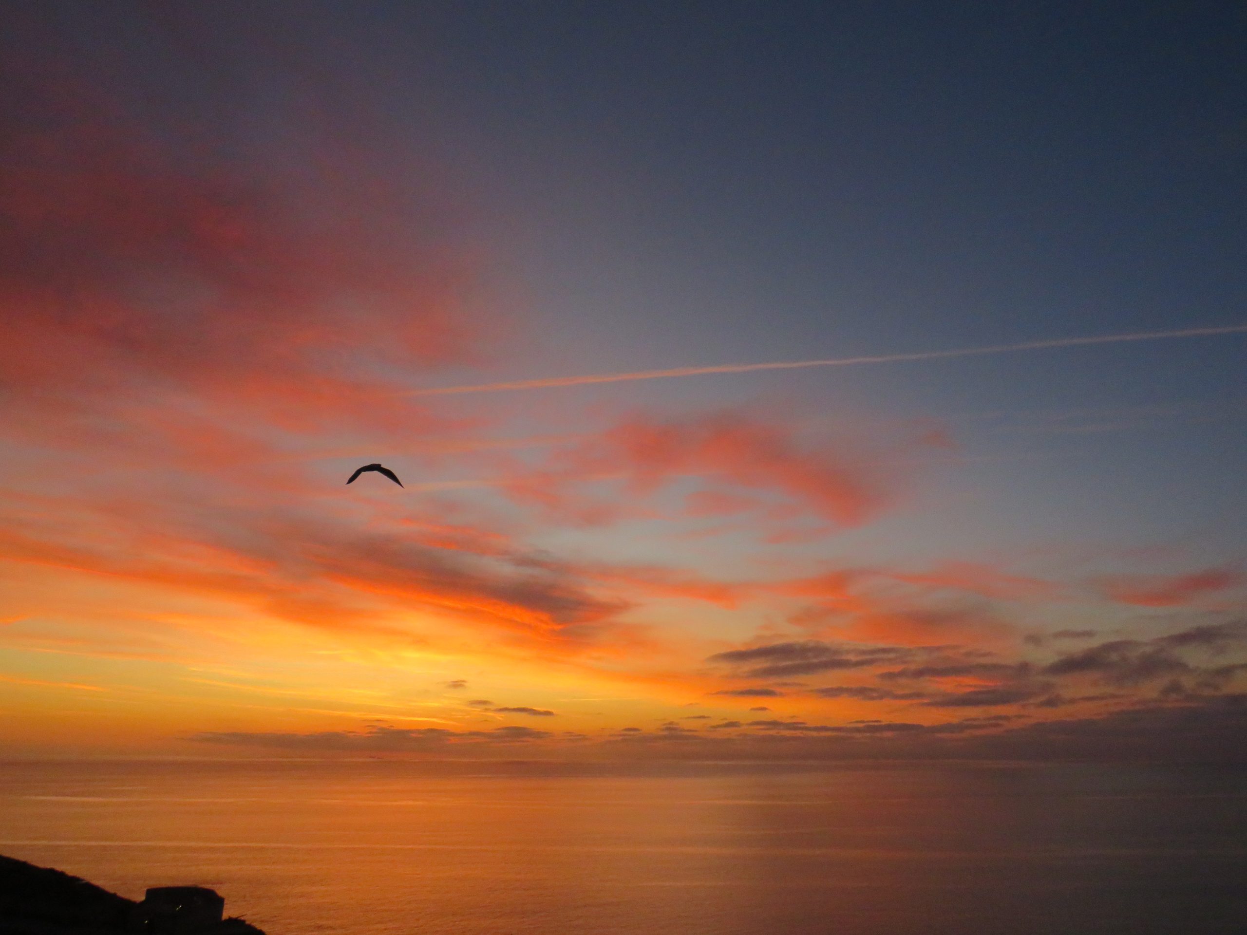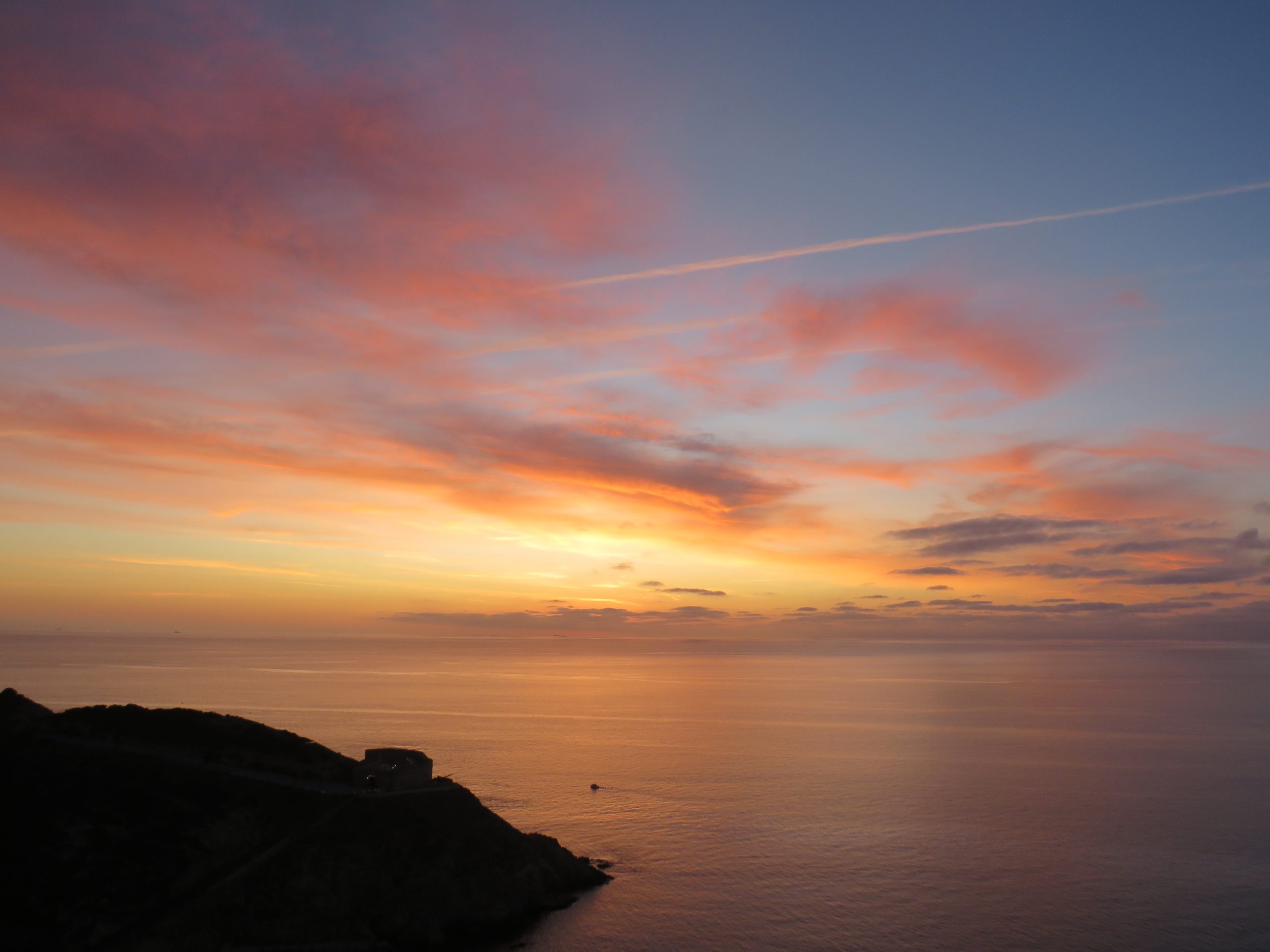 Asistimos emocionados a un amanecer de una indescriptible belleza El rubedo se despliega por el cielo incendiando el panorama. En los minutos previos a la salida del sol, el rojo se concentra en torno al punto por donde emergerá del mar para estallar en un dorado que lo cubre todo.