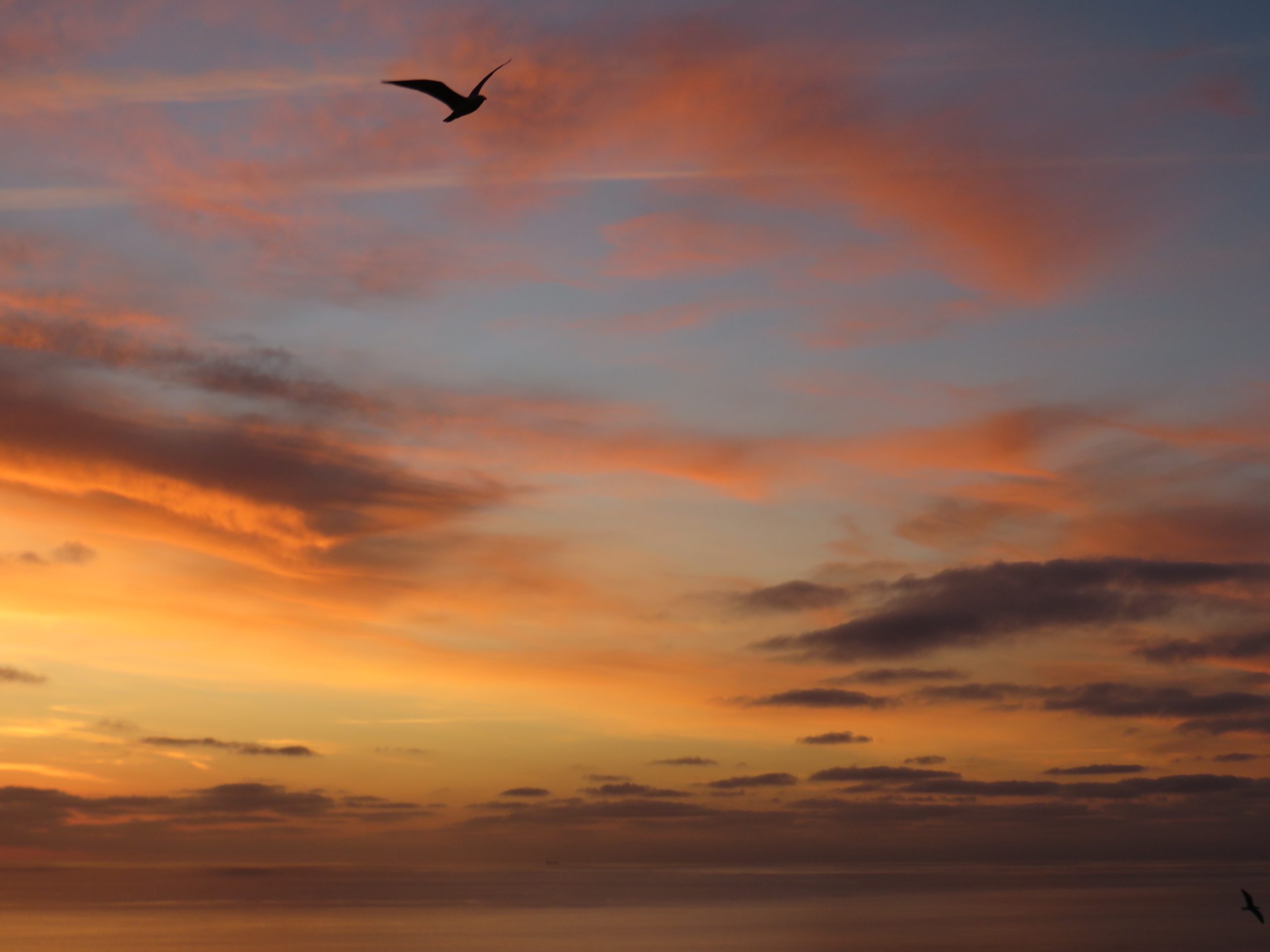 Son las 7:40h y los dos estamos inmersos en la escritura, con un ojo en el cuaderno y otro en el mar en calma y en las nubes que empiezan a reflejarse en la superficie marina. Son nubes jaspeadas y ligeras que absorben con facilidad las cambiantes tonalidades del amanecer. En este momento presentan una apagada tonalidad anaranjada.