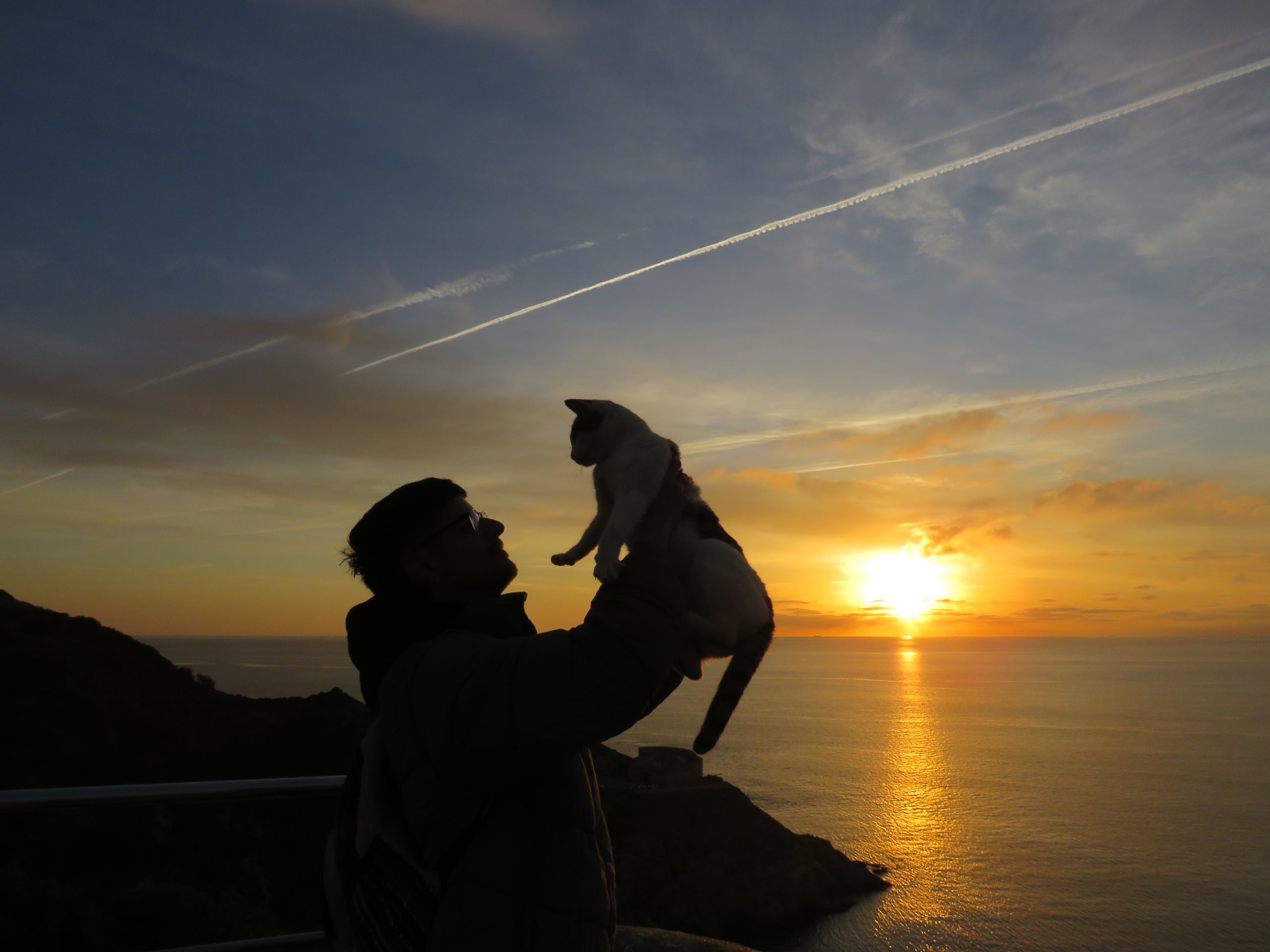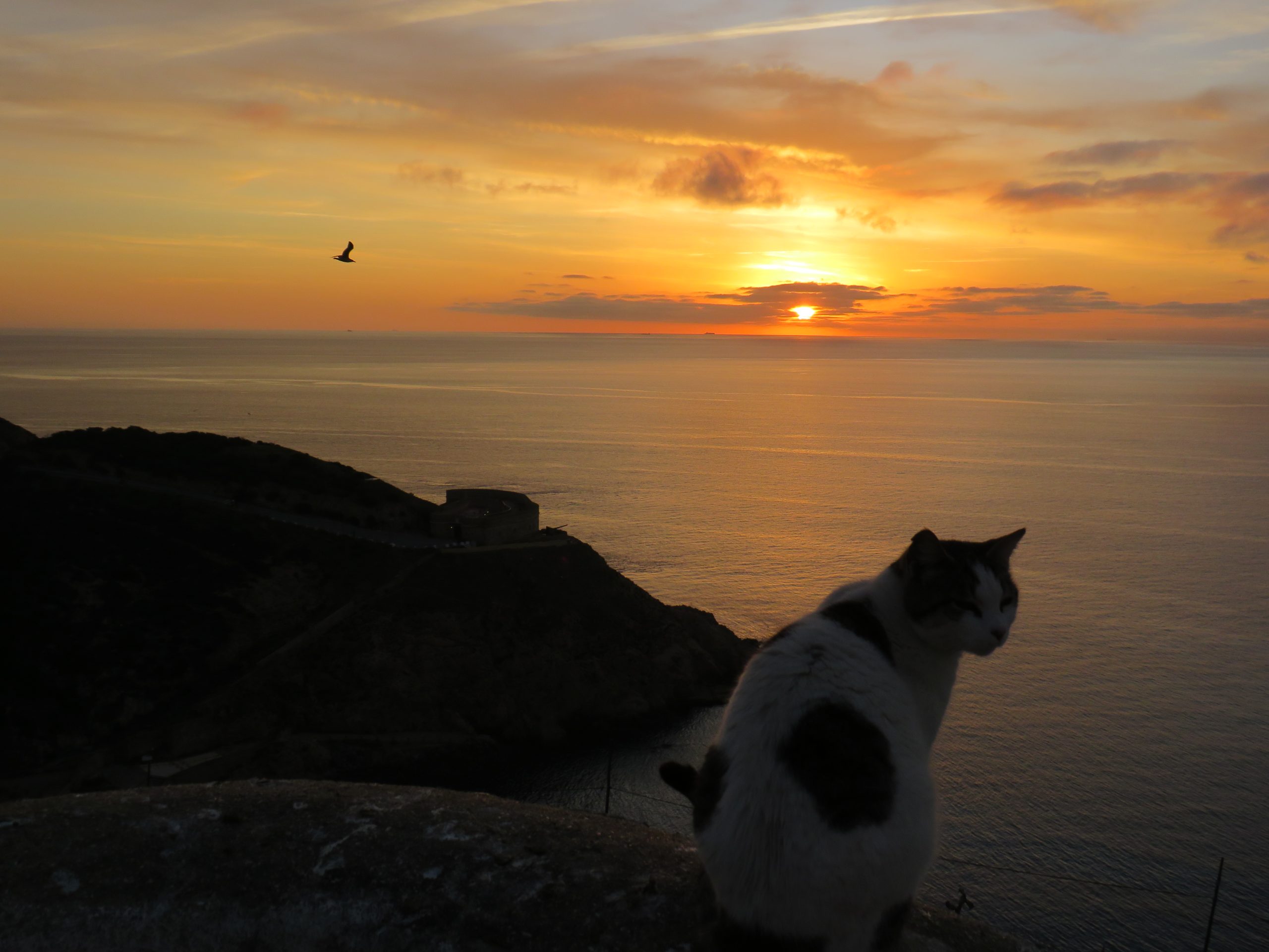 El sol se deja ver en su esfericidad para ocultarse tras unas nubes regalándonos nuevas tonalidades doradas y violaceas. Una curiosa gata se interpone entre nosotros y el sol reclamando nuestra atención. Su presencia nos permite tomar unas fotografías dignas de un premio.