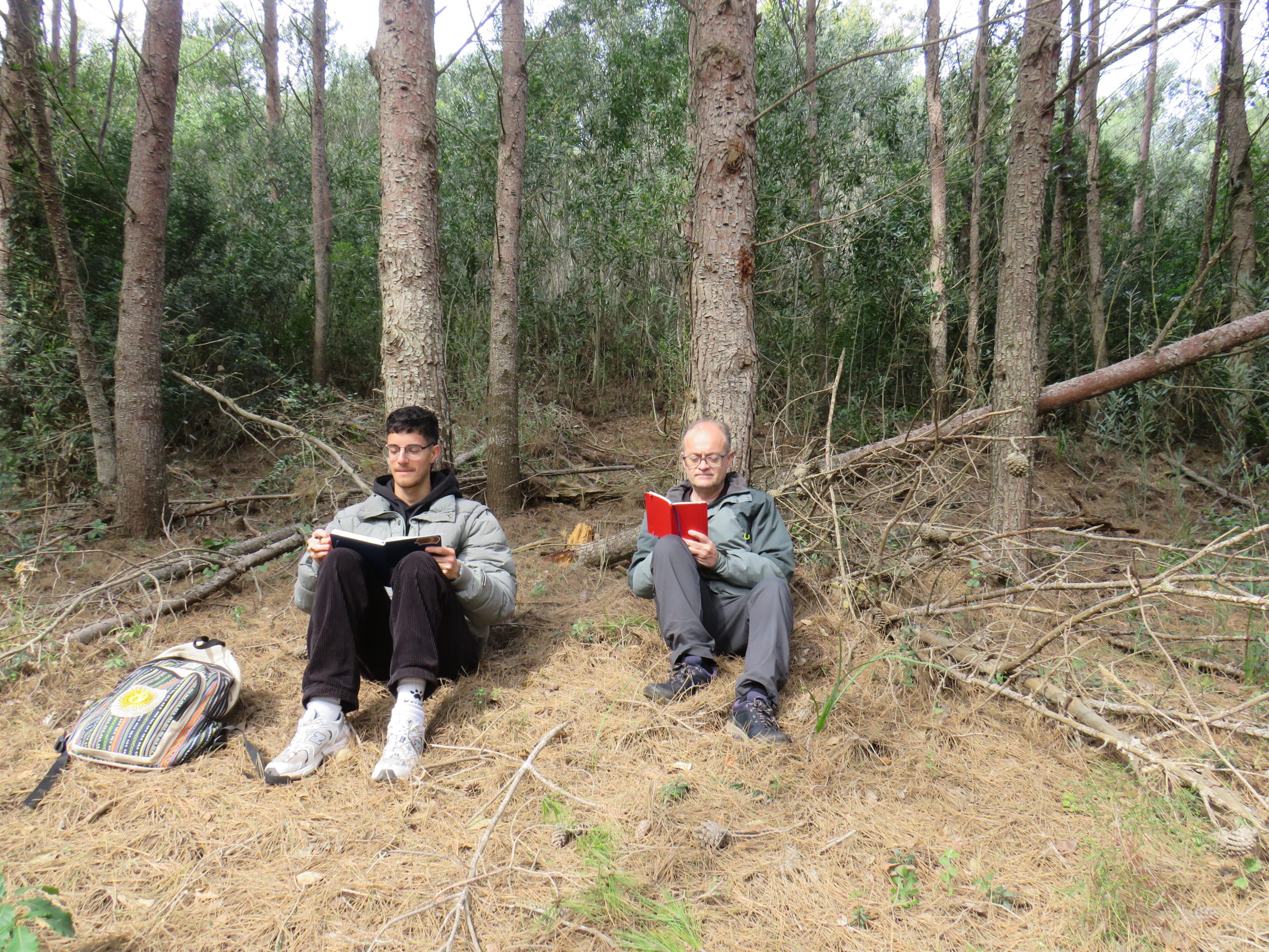 Apoyados en sendos pinos nos hemos dejado capturar por el espíritu de este lugar que nos susurra su mensaje sirviéndose del viento: le gusta que vengamos a conocerlo y a ser sus altavoces.