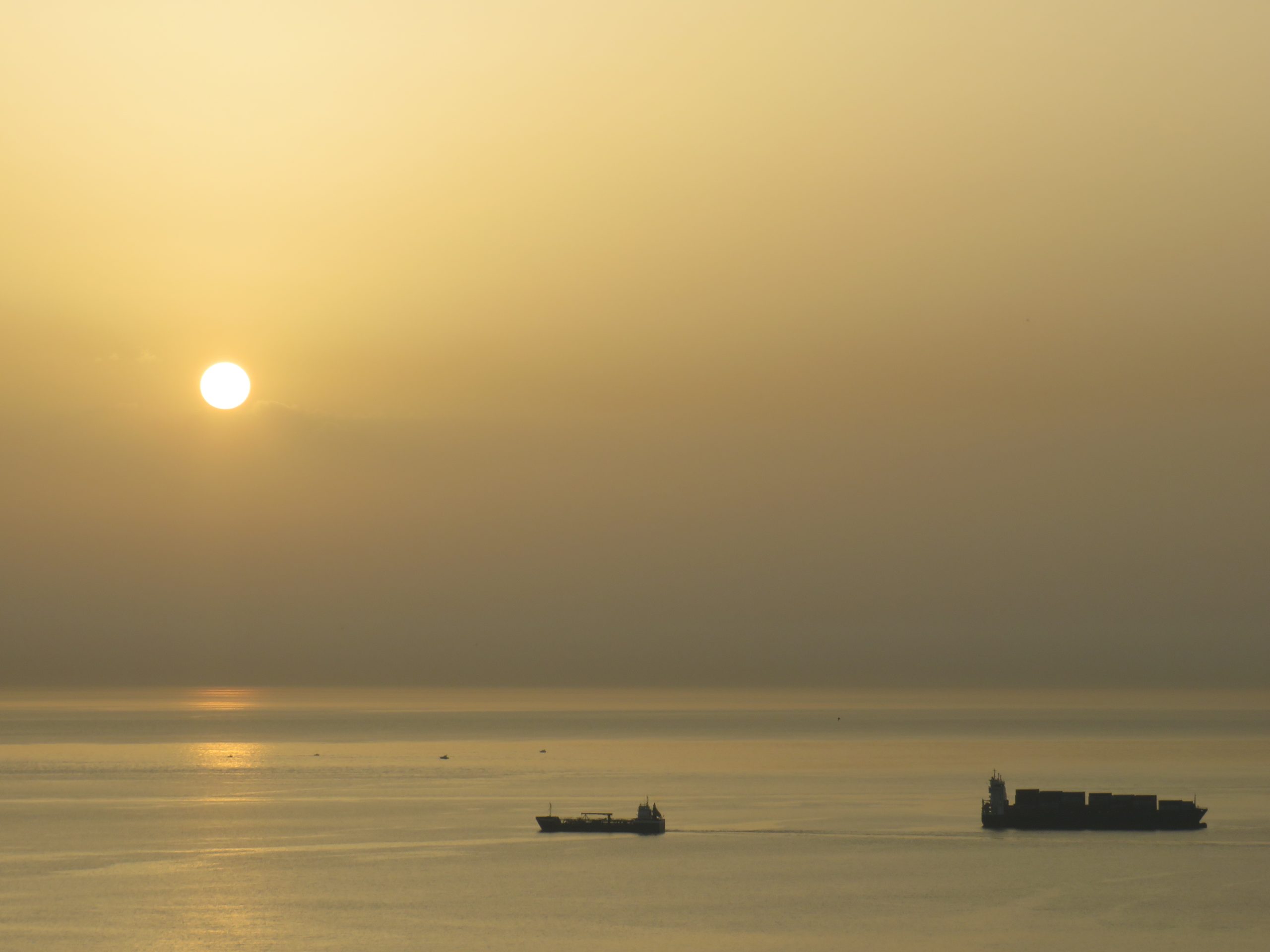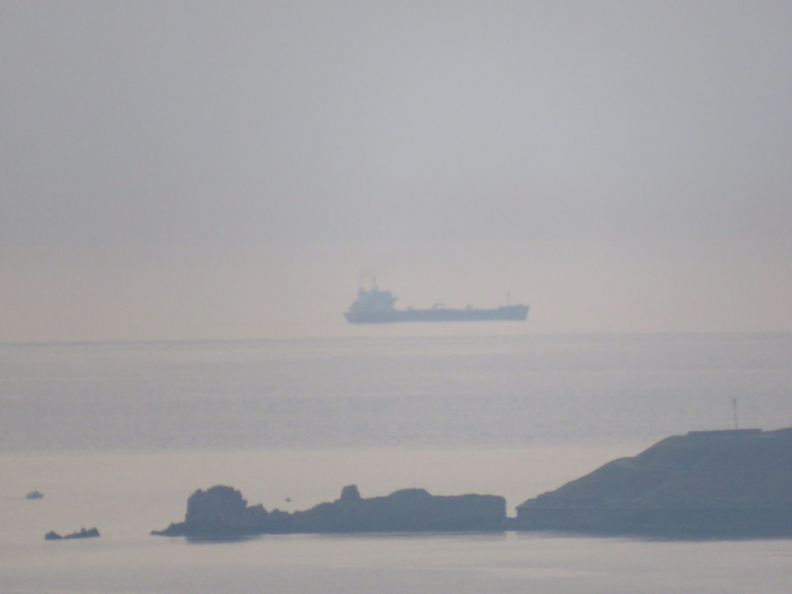 Son las 6:55 h. Quedan diez minutos para el amanecer de este sagrado domingo de Pentecostés. Sopla un húmedo viento de levante que ha desplegado una tenue niebla sobre el Estrecho de Gibraltar y Ceuta. El mar está en calma con la misma tonalidad grisacea de las nubes bajas que cubren el horizonte. De esta manera cuesta saber por dónde asomará el sol en este nuevo día. Es tal la confusión óptica, que da la impresión que los barcos más lejanos navegan en el cielo.