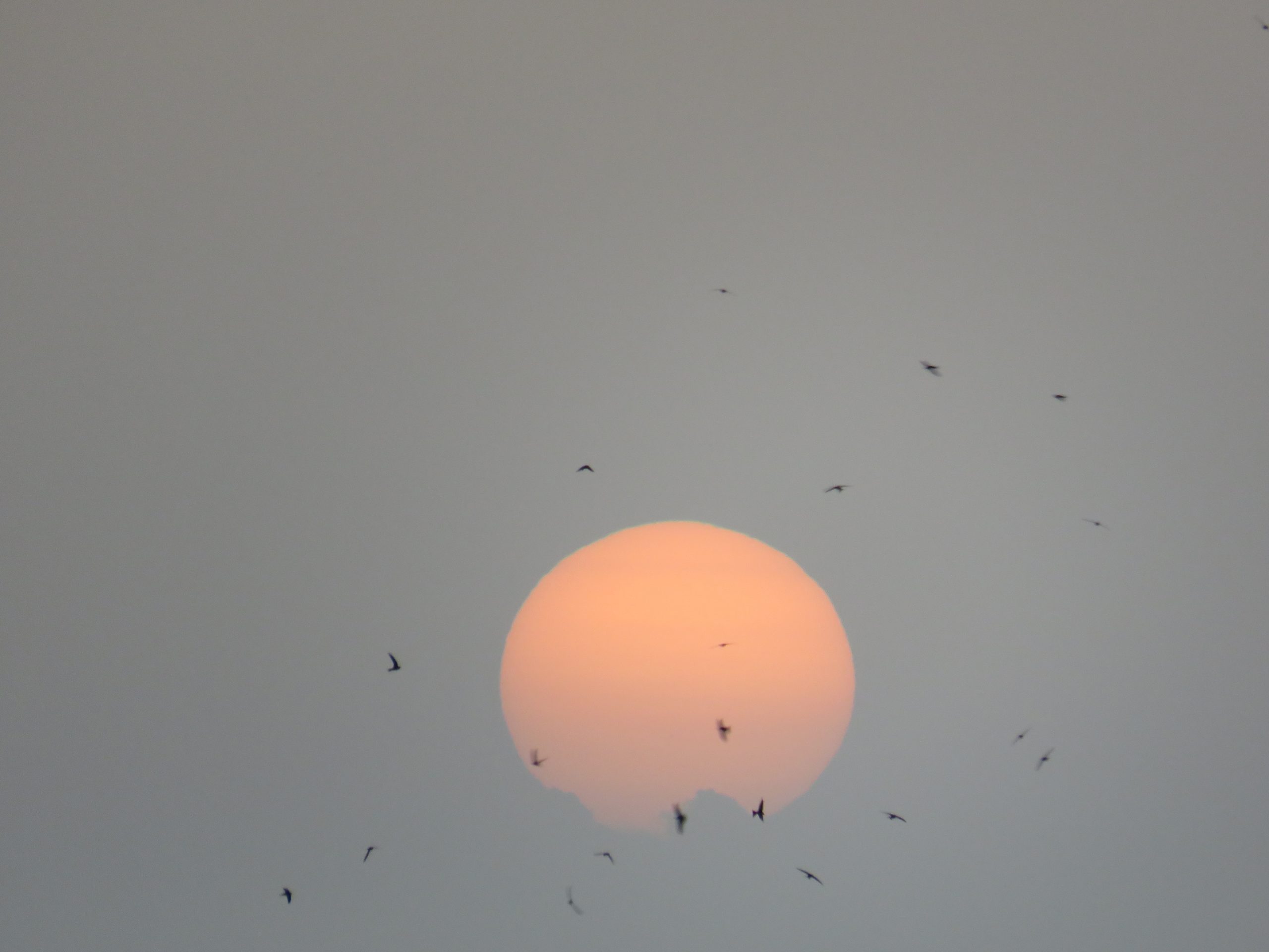 El sol emerge entre las nubes rodeado de un enjambre de vencejos. Es una perfecta esfera dorada que se deja ver gracias al filtro protector de la neblina. Su luz no empieza a ser cegadora hasta pasados veinte minutos.