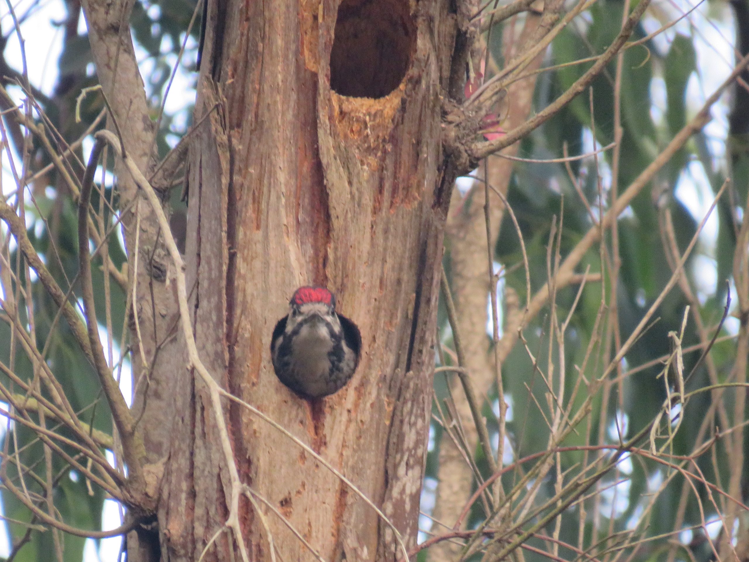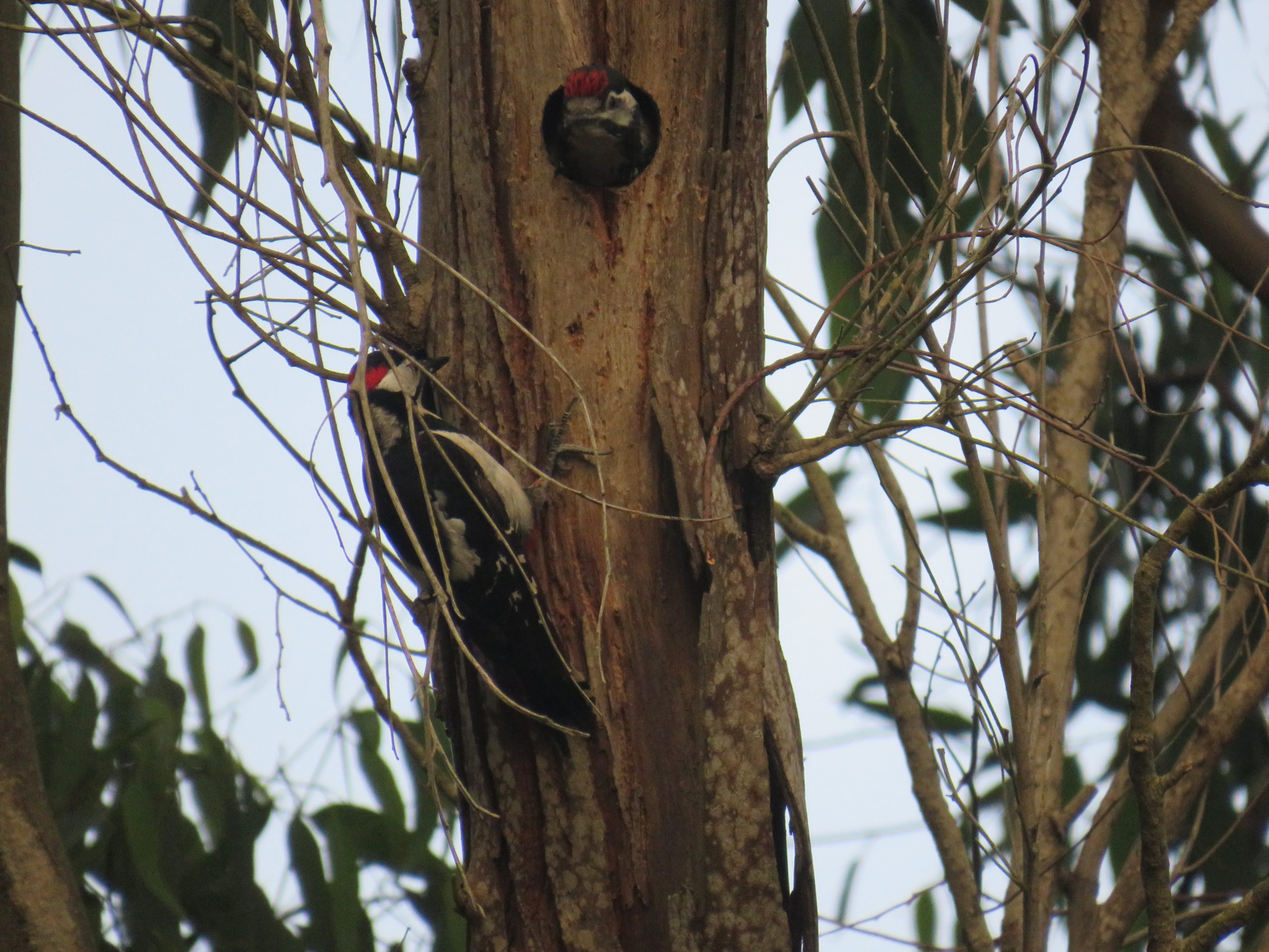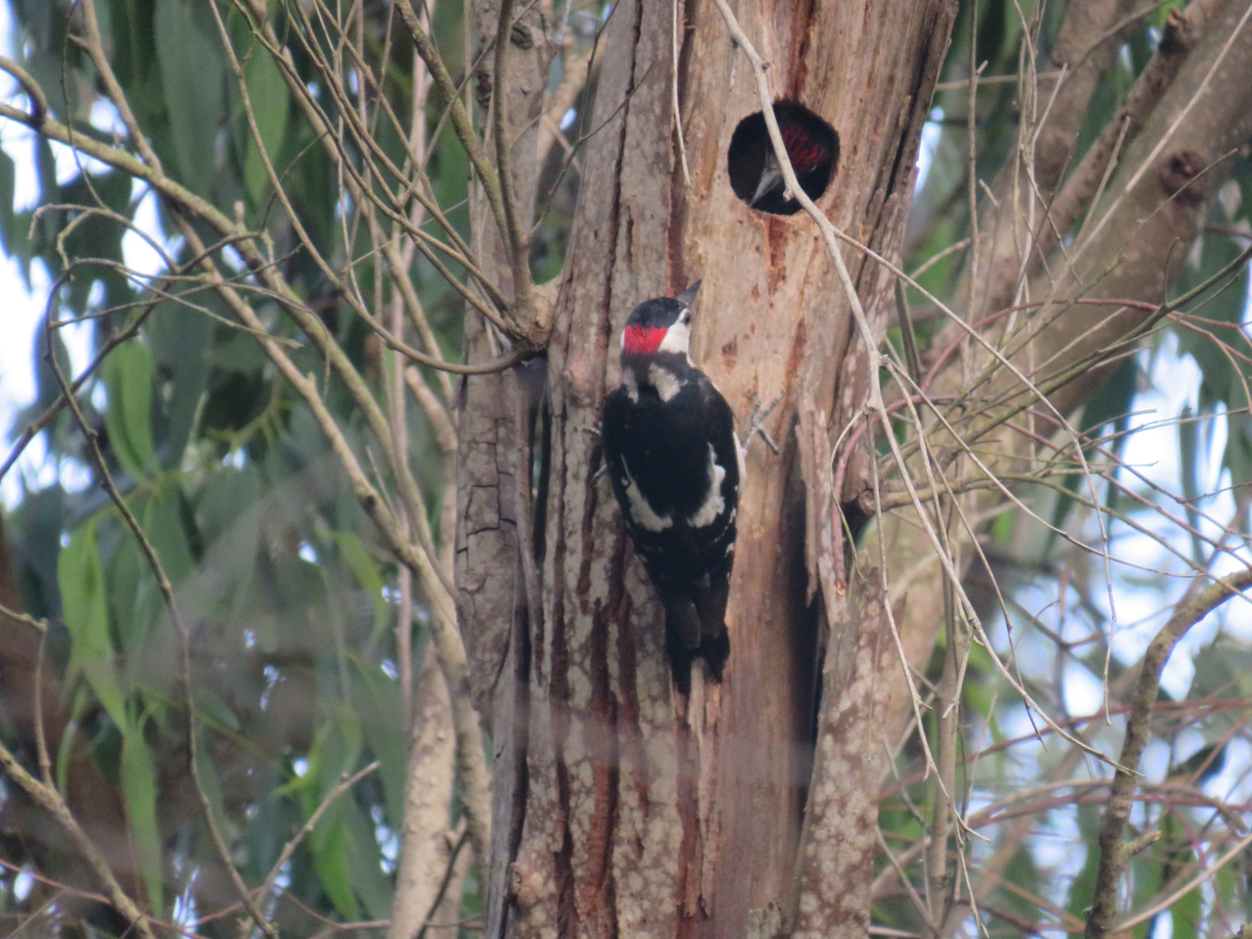 Nada más doblar la curva del camino observo que un picapinos se posa junto a un redondeado orificio abierto en el tronco de un eucalipto. Por él se asoma un polluelo. Nos quedamos mirándonos igual de intrigados el uno respecto al otro.