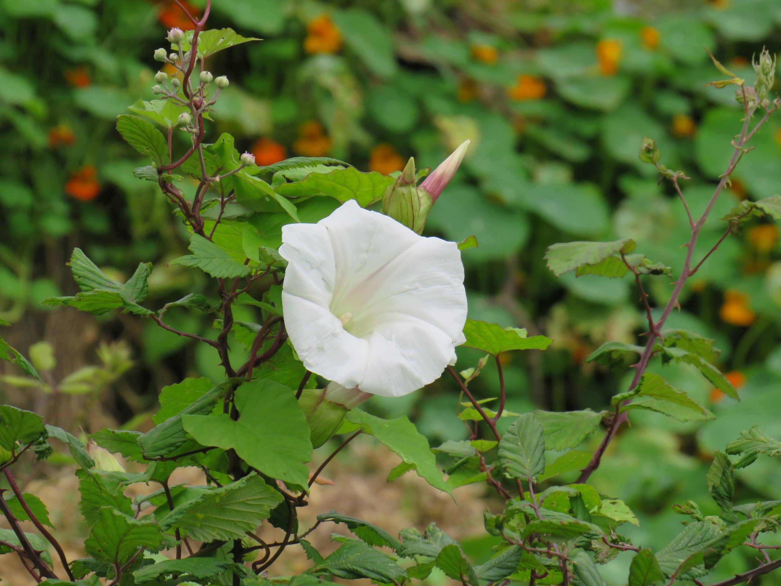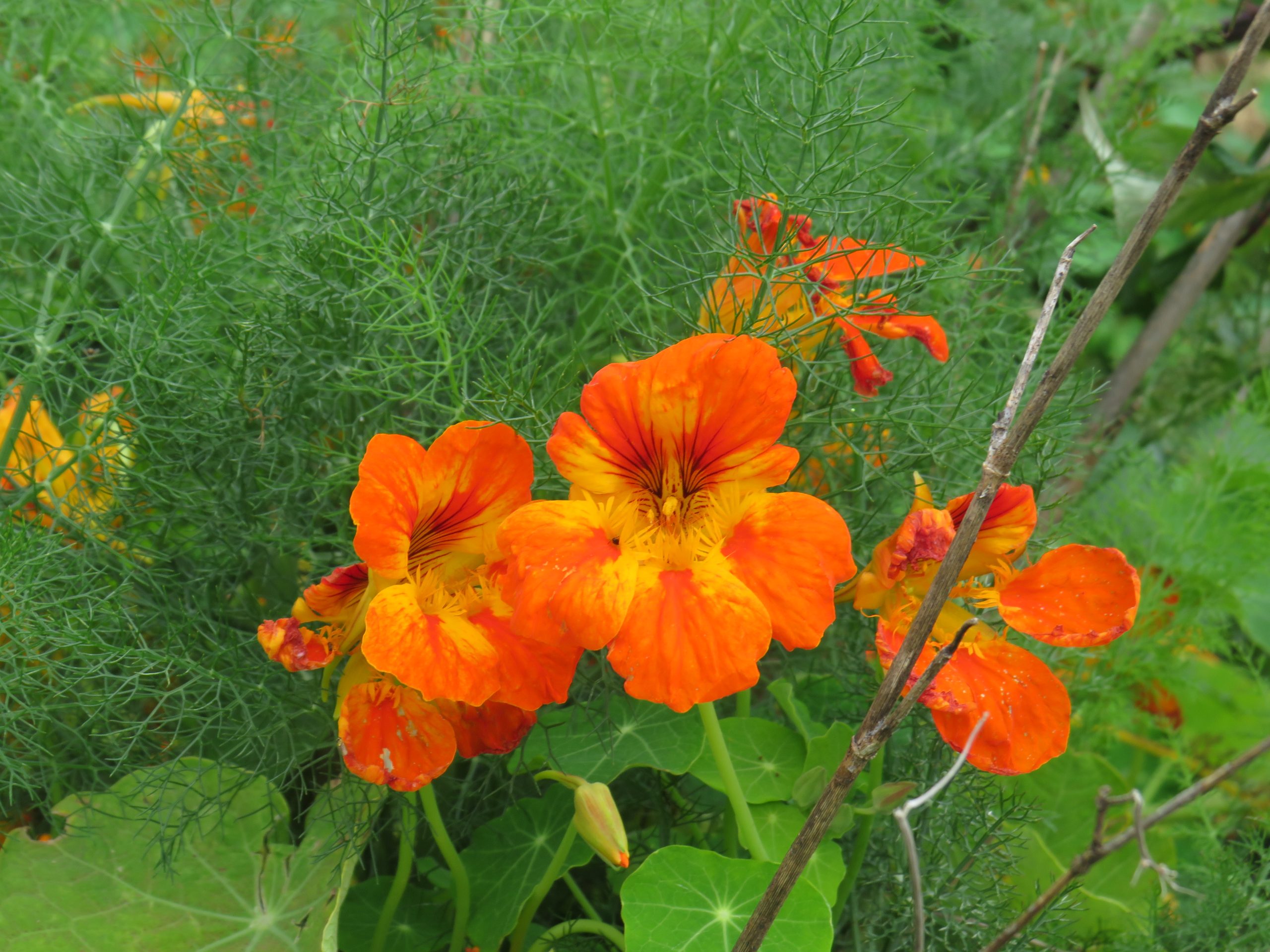 No menos hermosas son las grandes flores de las hiedras. Las capuchinas aportan un toque luminoso y colorido entre el rojo y el amarillo.
