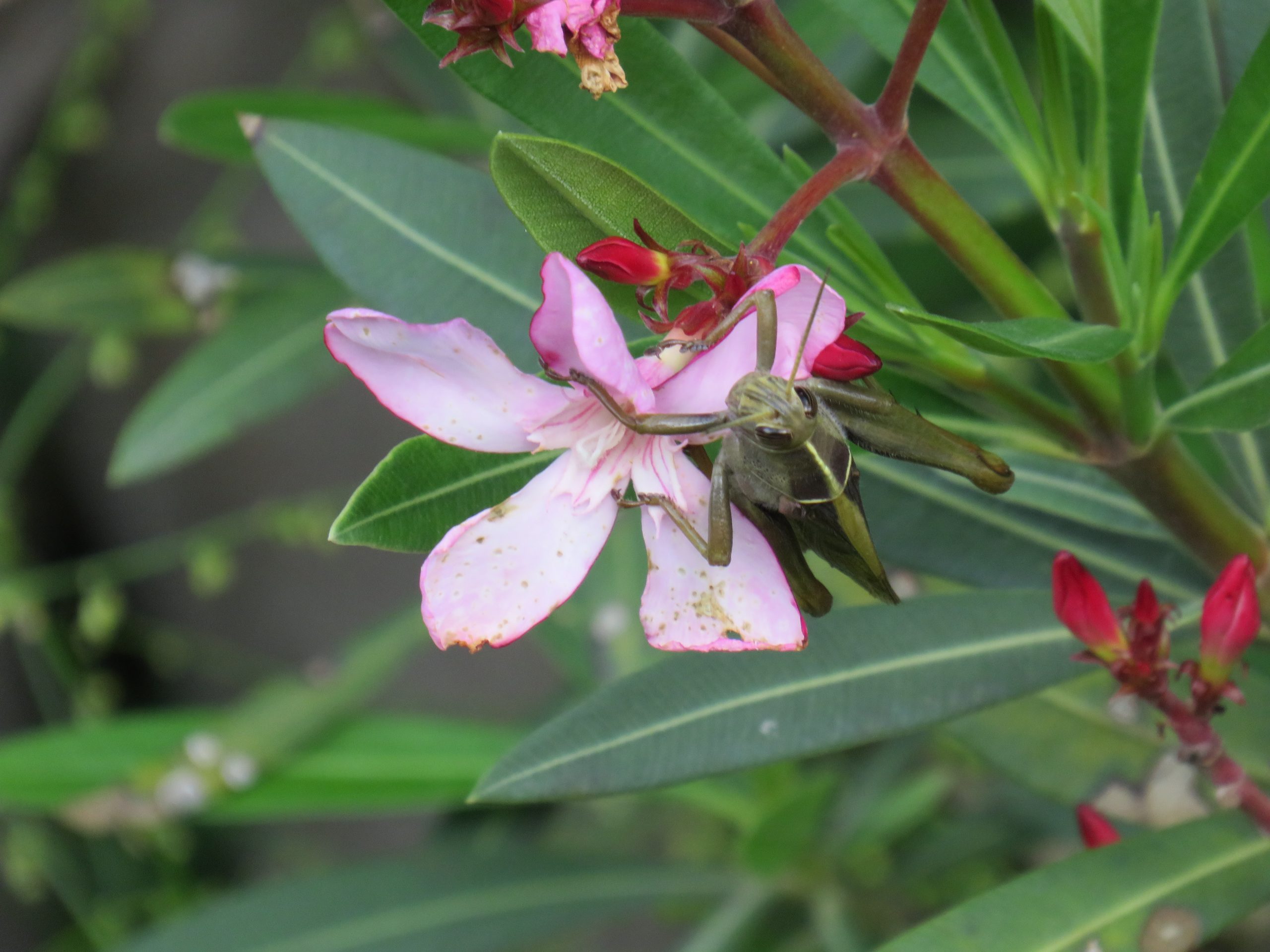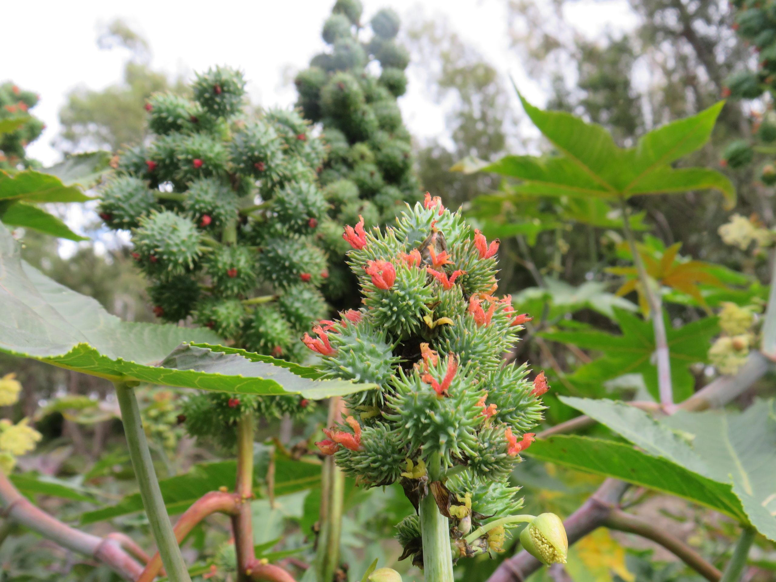 El ricino, por su parte, ofrece sus diminutas flores. No obstante, las reinas del arroyo del arroyo de Calamocarro son las flores helicoidales de color rosa. Muchas flores de las adelfas no se han abierto y presentan un intenso color rojizo.