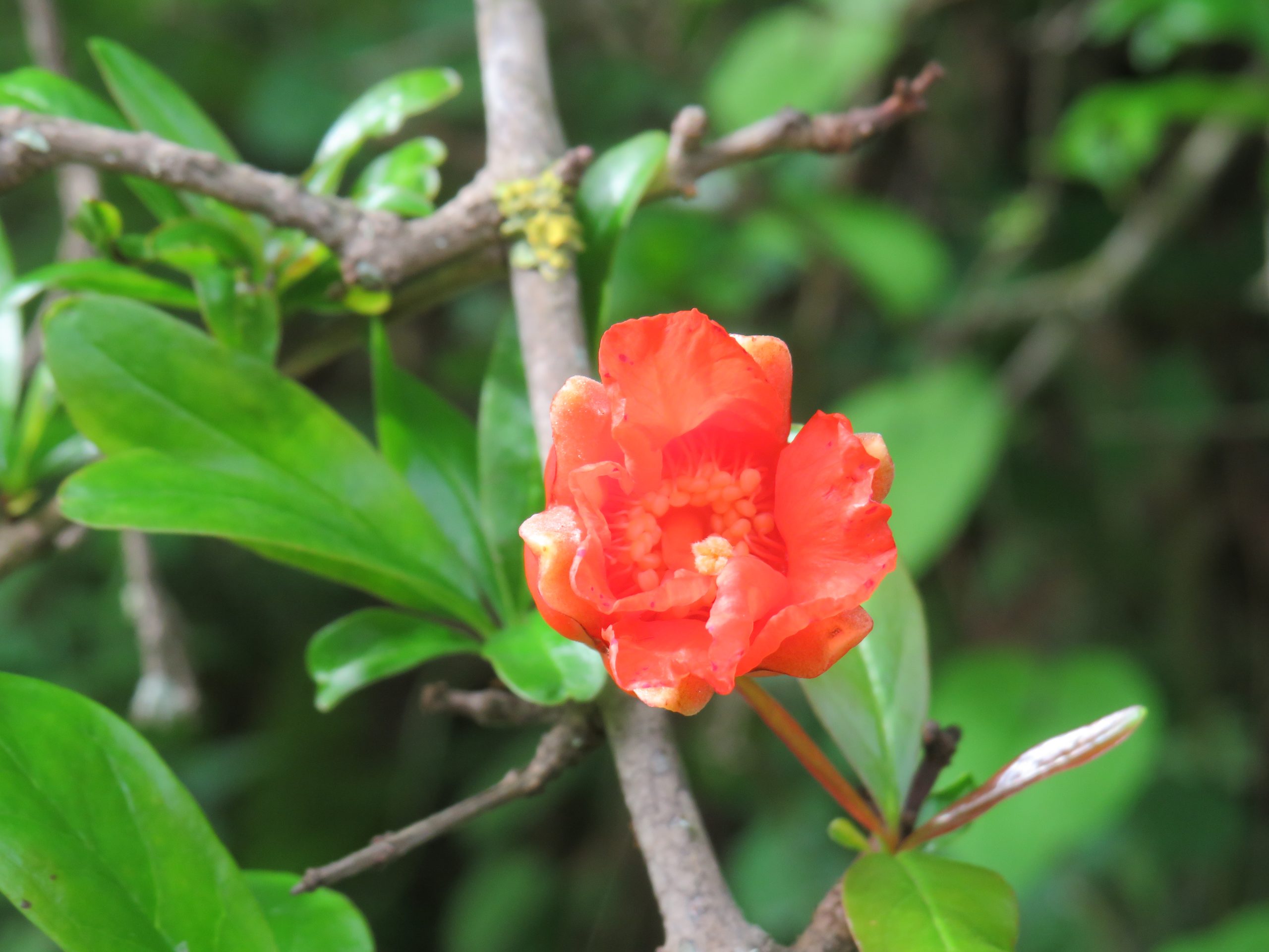 El granado en flor es muy atractivo. Es una mezcla entre fruto y flor.