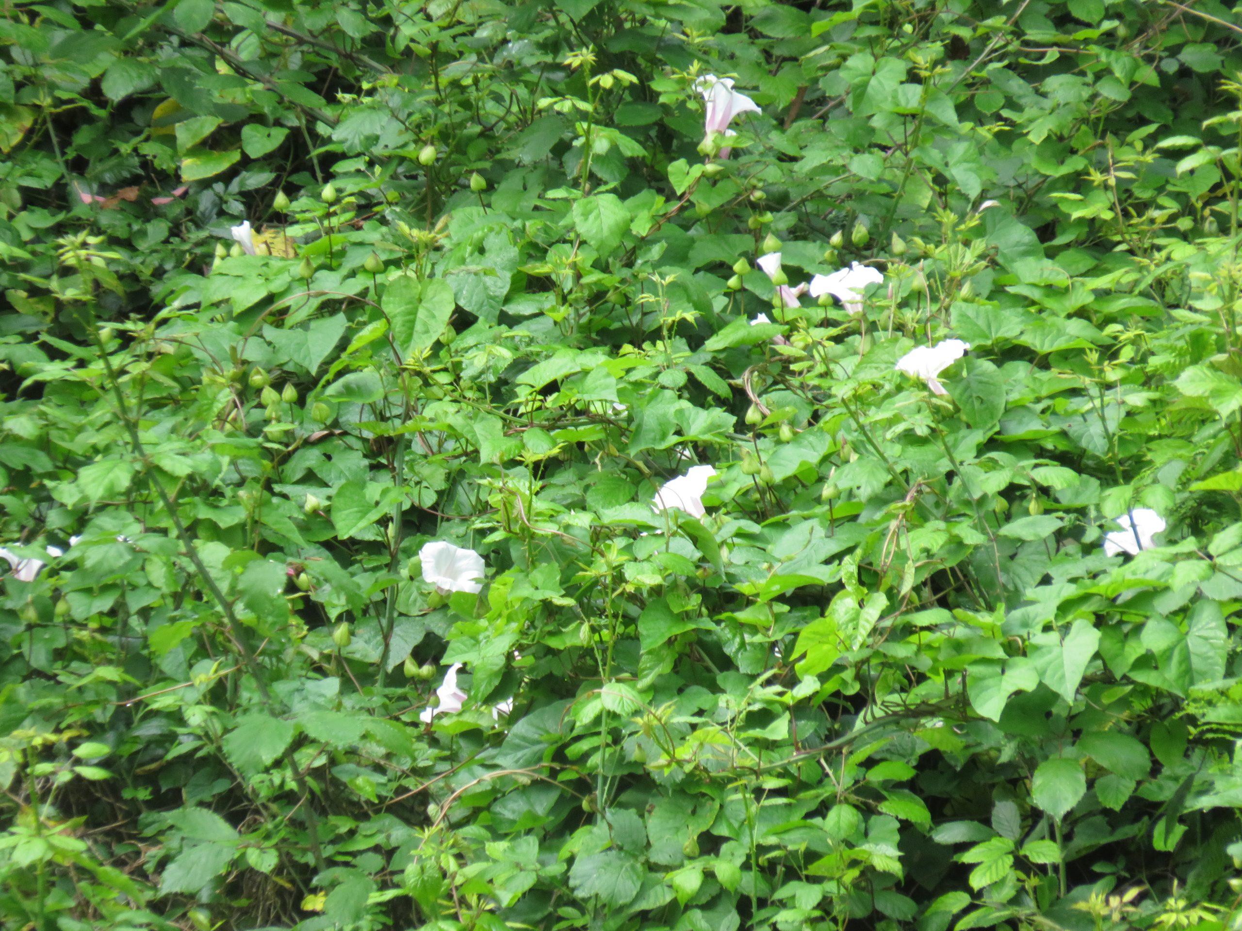 El cauce del arroyo se oculta tras un tupido manto de hiedras que asoman sus grandes flores blancas.