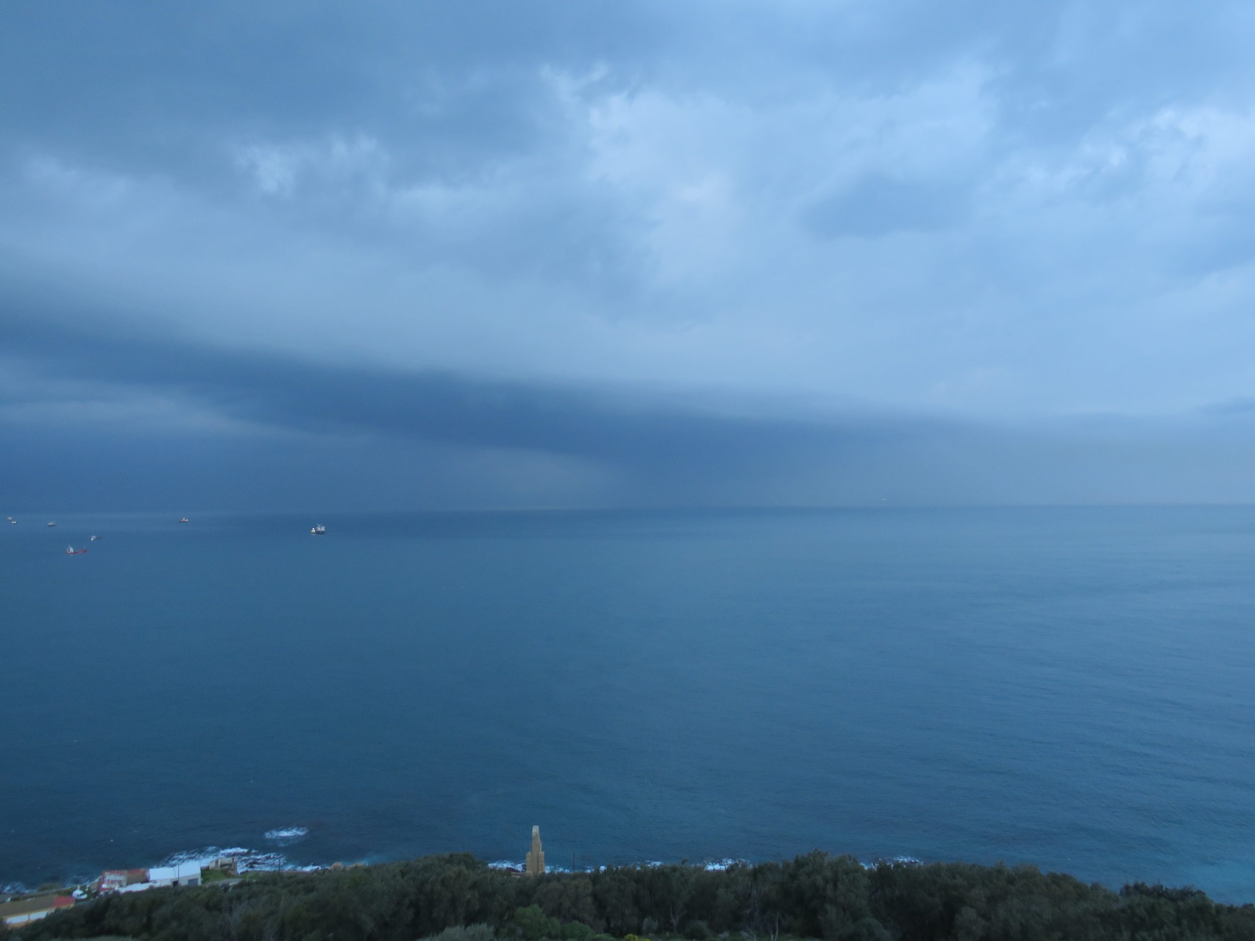 El mar adquiere una tonalidad verdiazulada sobre la que se reflejan las oscuras nubes cargadas de agua. Justo a la hora del ocaso comienza a diluviar.