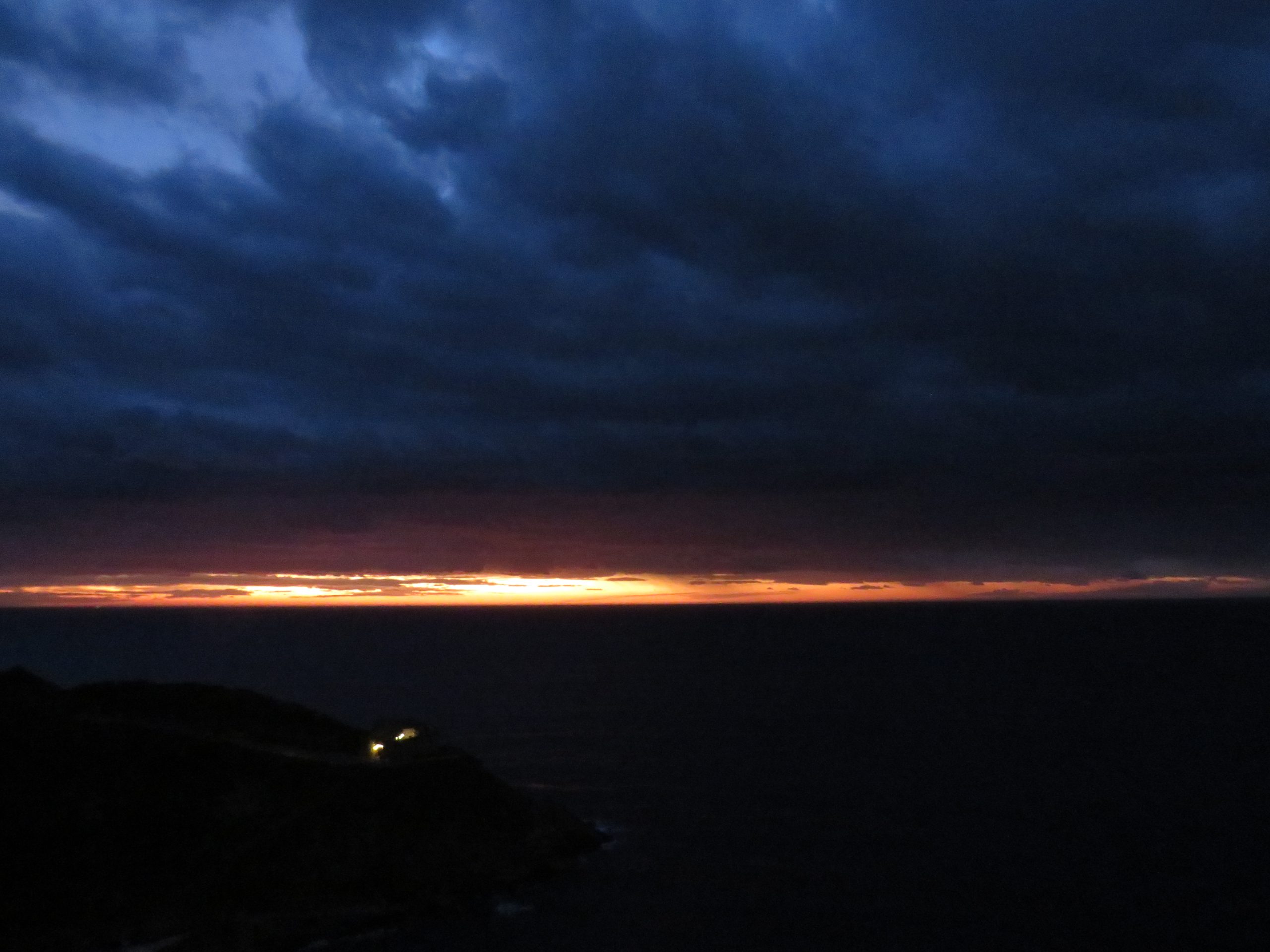 La suerte ha estado de mi lado. Entre las nubes y el horizonte quedaba abierta una franja despejada que concentraba los colores anaranjados y rojizos que anteceden a la salida del sol. La densas y oscuras nubes son conducidas a gran velocidad por el viento de poniente. La cortina de lluvia es visible en el mismo espacio en el que el rojo es más intenso.