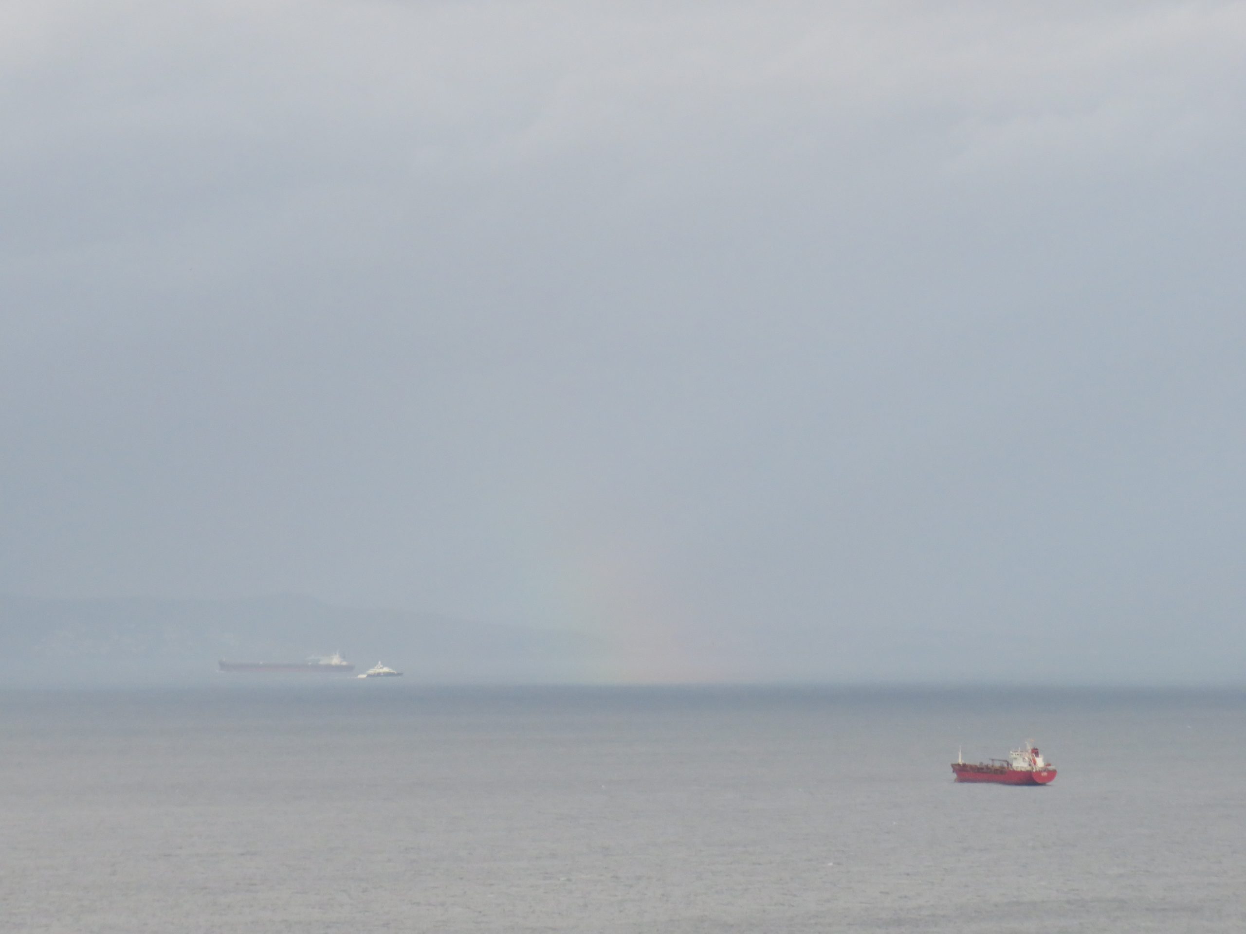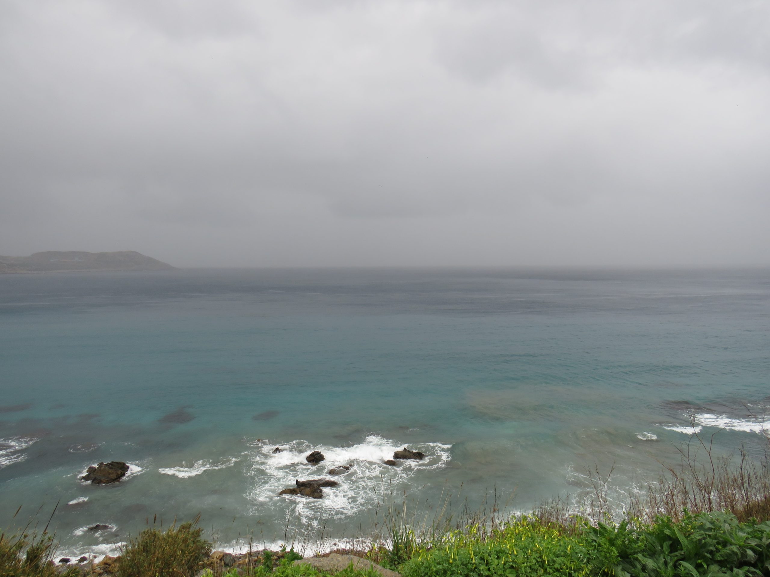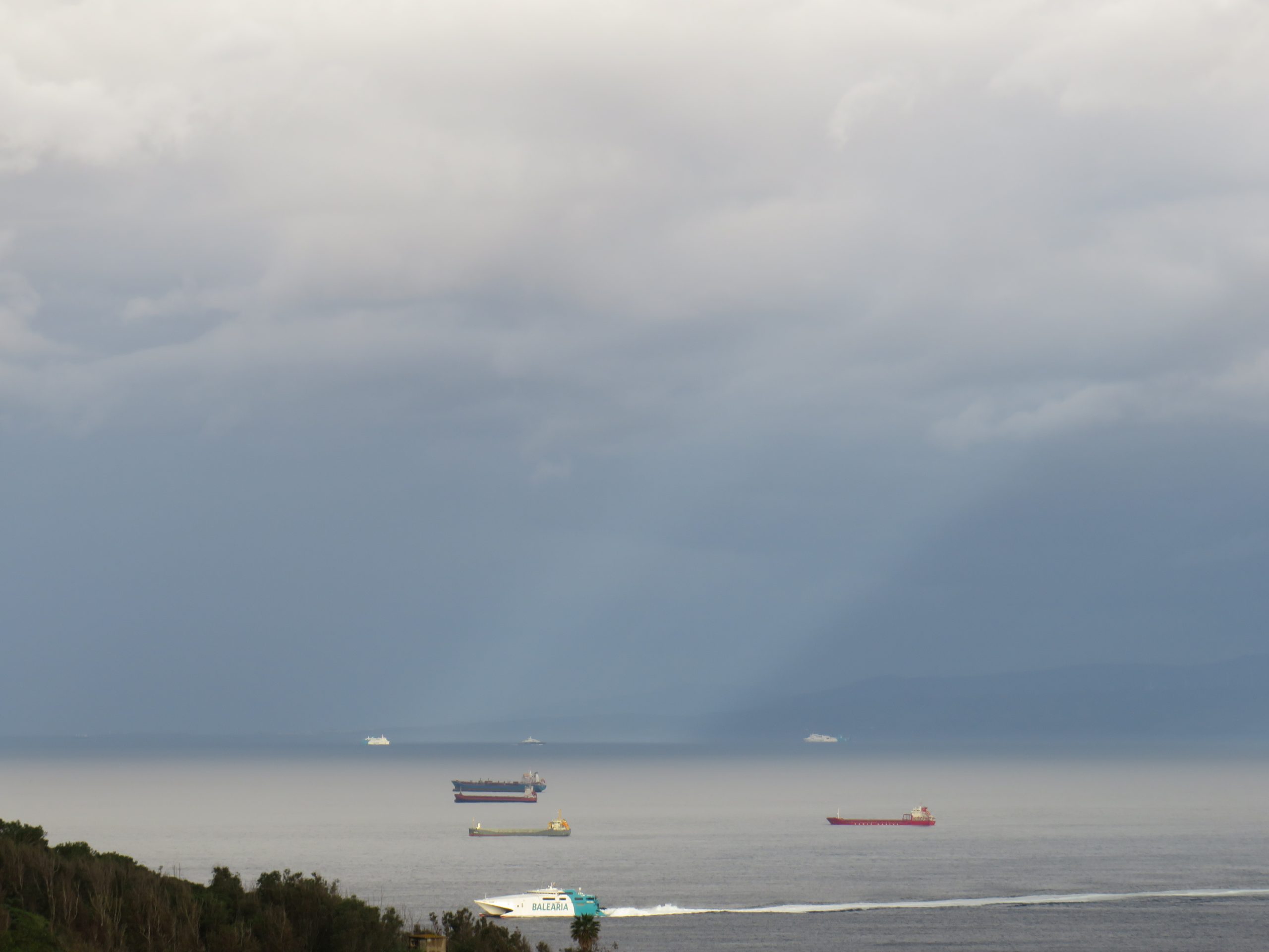 El frente de lluvia se extiende entre Tarifa y Getares. No creo que tarde mucho en atravesar el Estrecho y llegar a Ceuta. El avance de la lluvia, al encontrarrse con la luz del sol, dibuja el arranque de un arcoíris que no llega a fructificar.