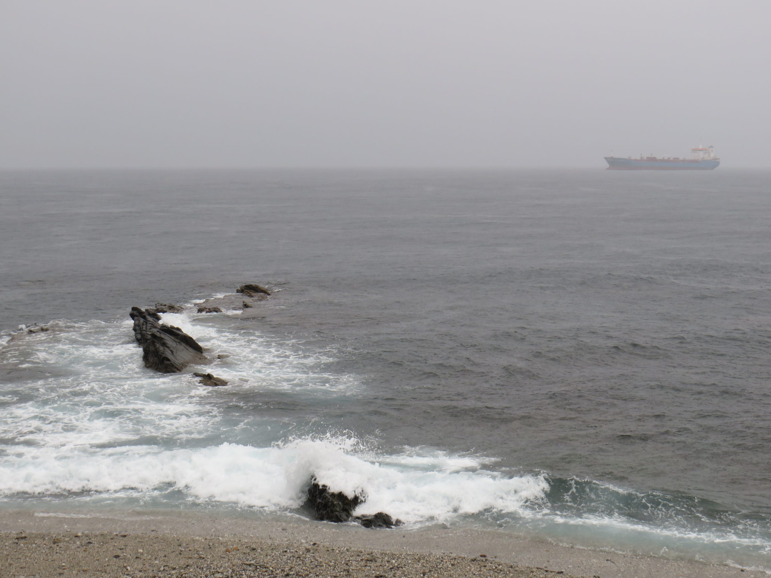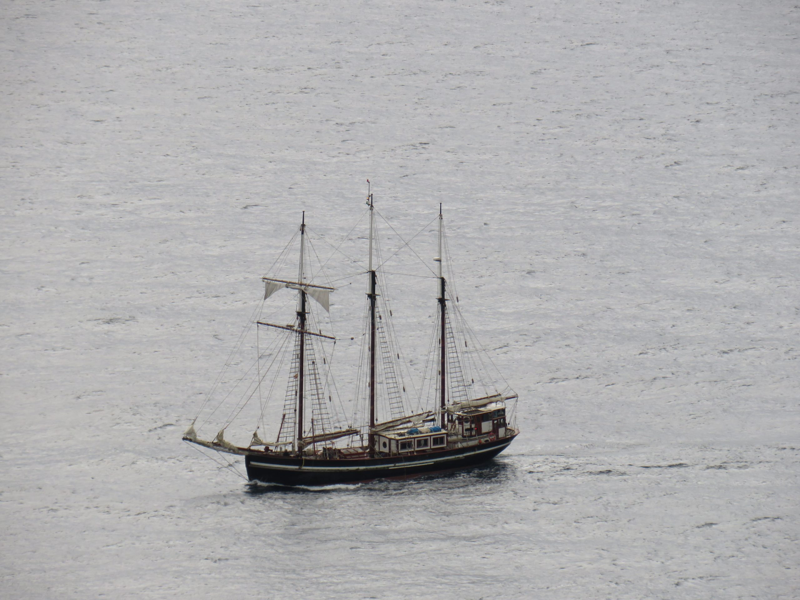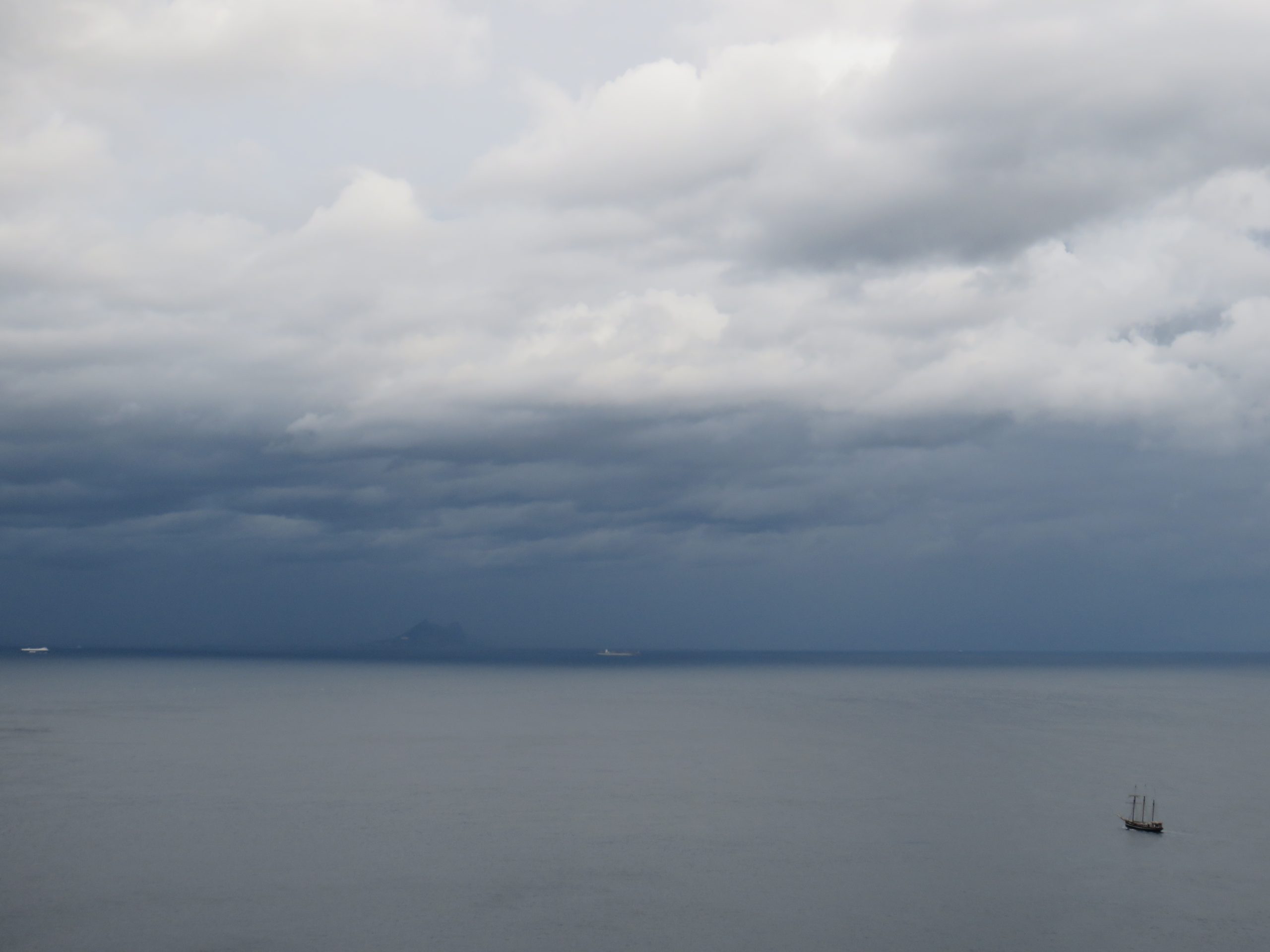 Un velero, más propio de tiempos pretéritos, pasa a escasa distancia de Punta Almina y toma dirección a la bahía de Algeciras ennegrecida por la lluvia.