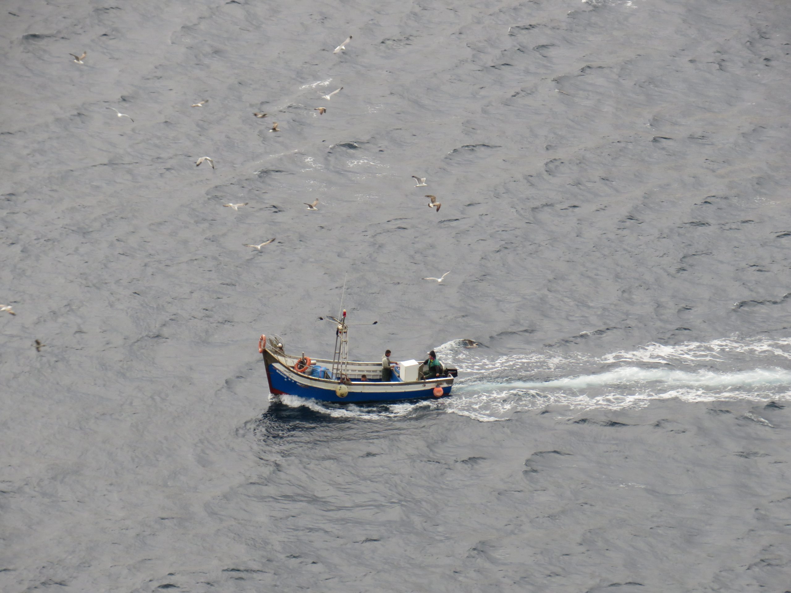 Las pequeñas pateras y botes pesqueros regresan a puerto escoltados por decenas de gaviotas.