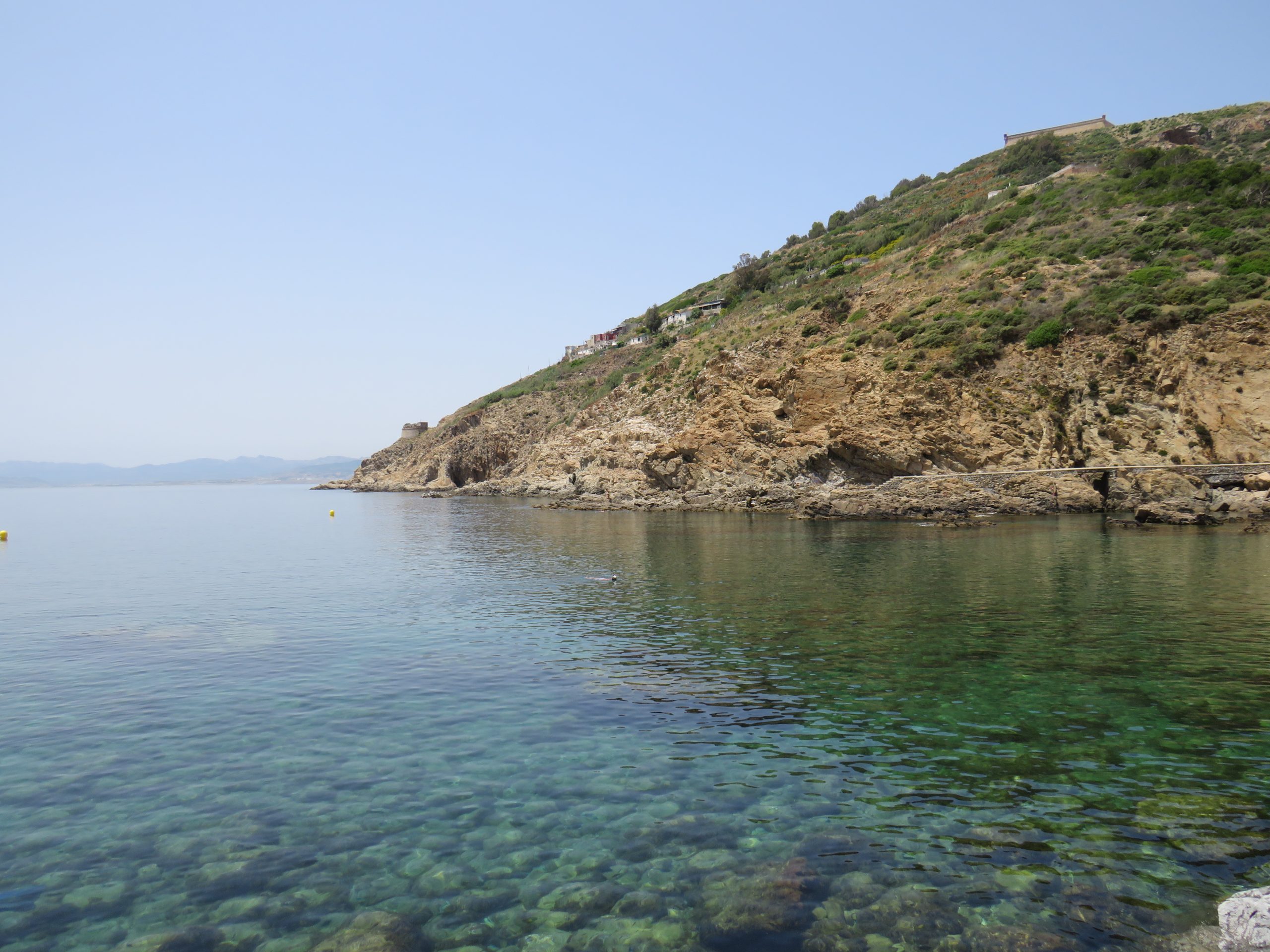 No perdí ni un segundo en meterme en el agua con mi gafas y tubo de buceo. La temperatura era ideal y la transparencia del agua permitía contemplar a la perfección el fondo marino y las rocas que se aoman a la superficie o permanecen depositadas en el lecho marino. Entre ellas se mueven muchos peces, cuyos dorsos, al reflejar la luz penetrante adquieren un aspecto plateado. Allí donde la profundidad absorbe la luz todo reluce azul.